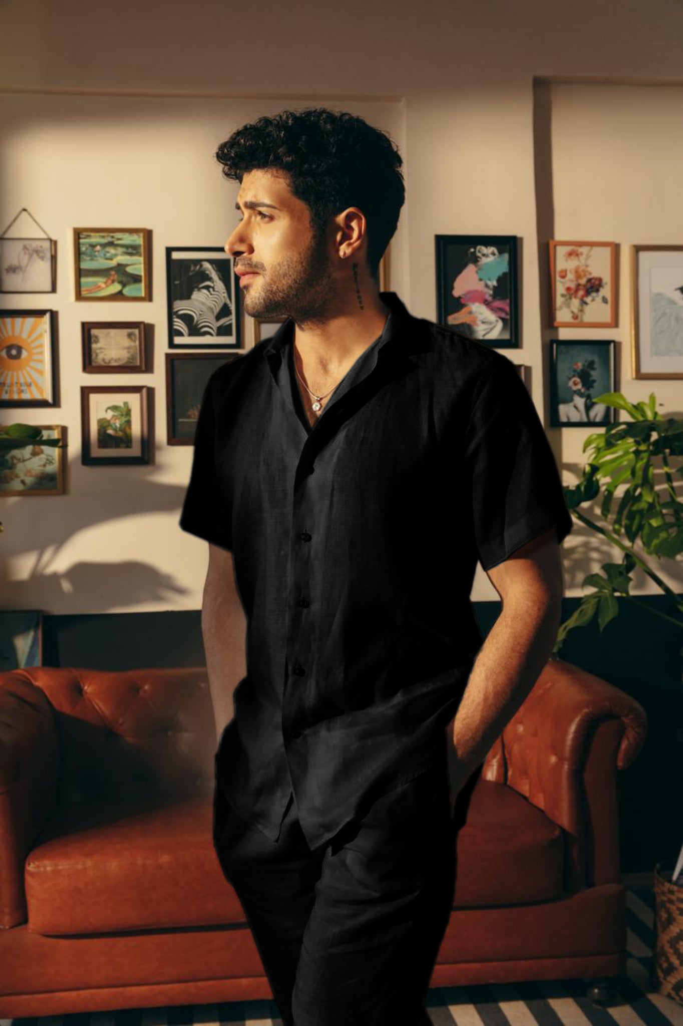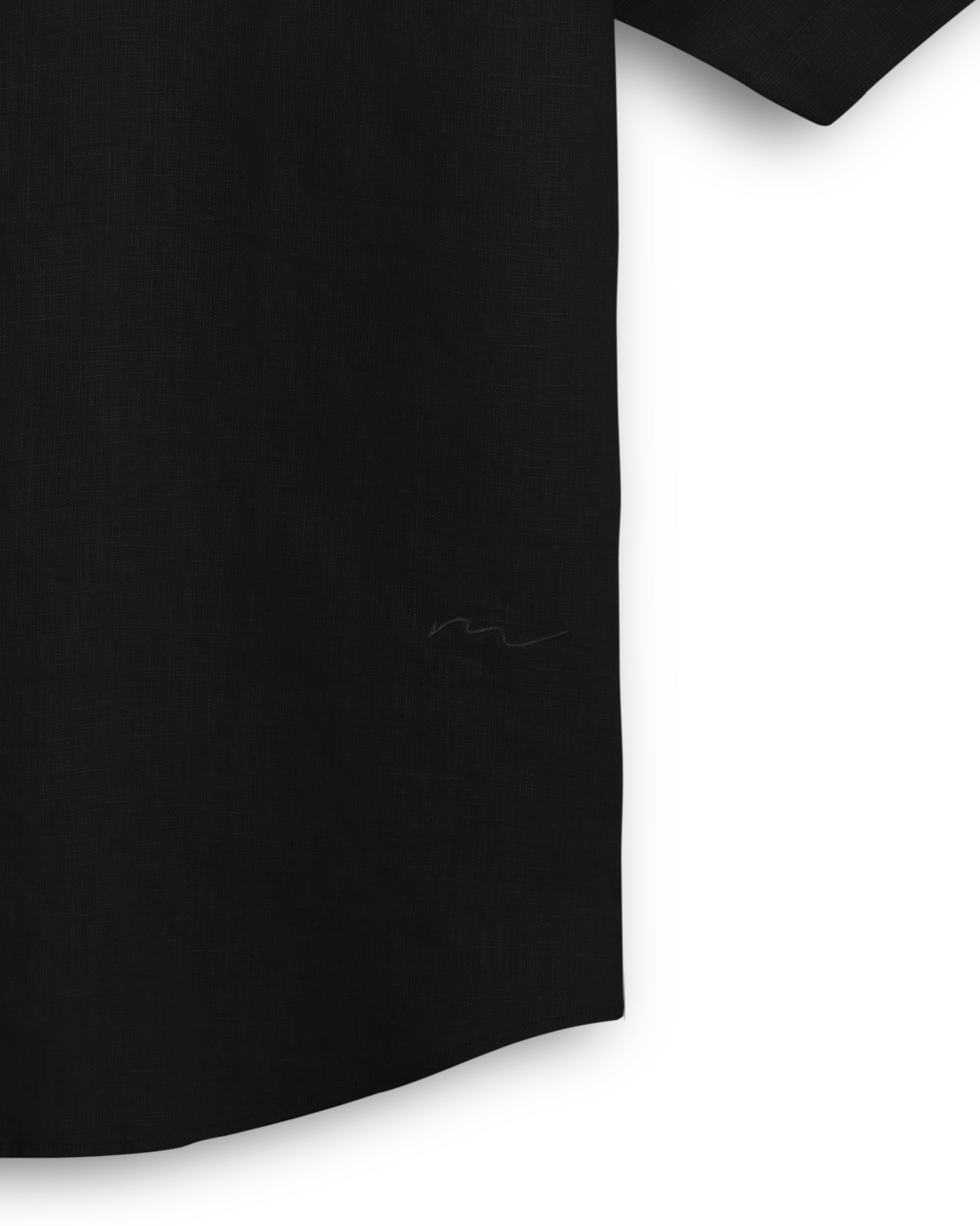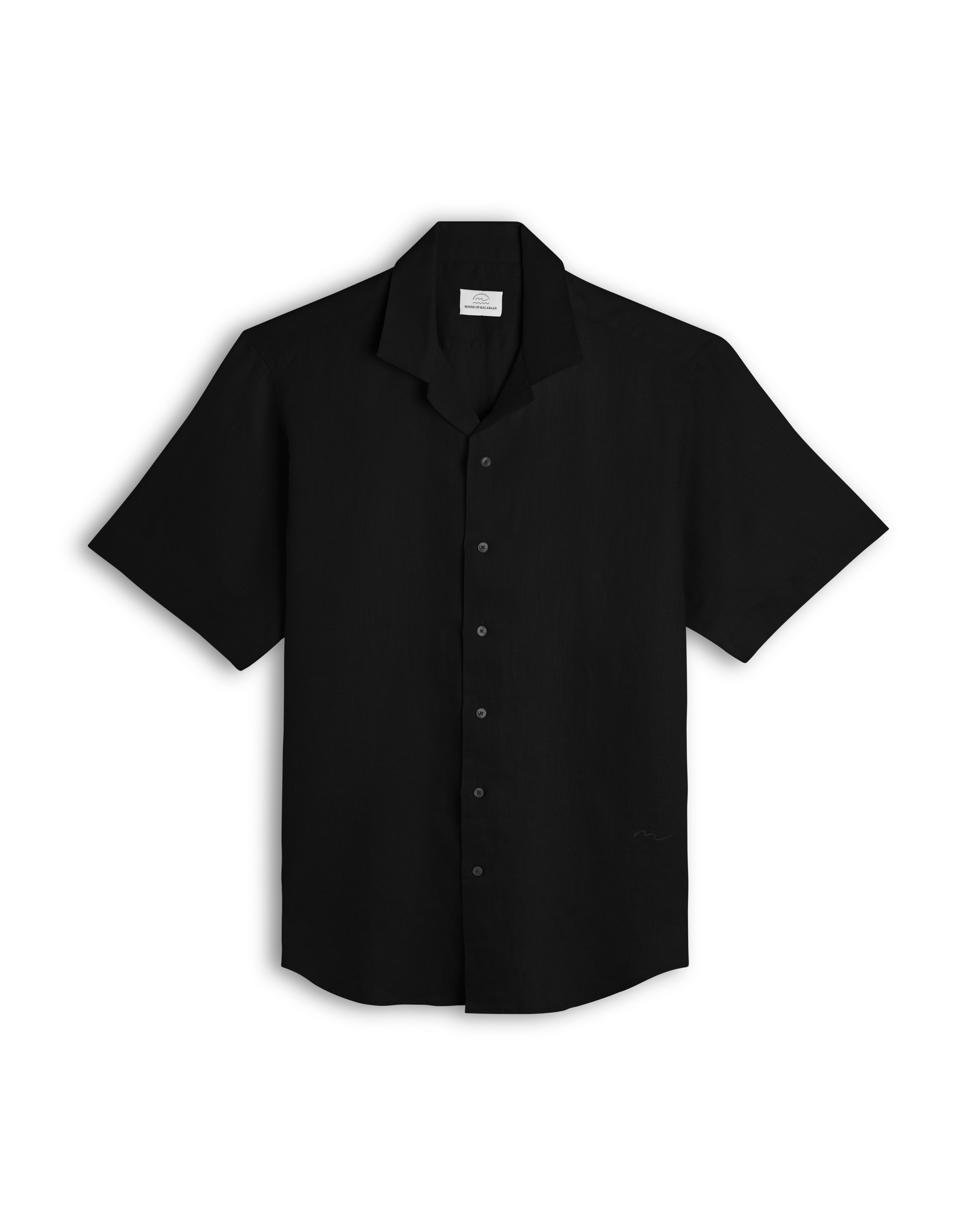 Crafted from 100% premium Black linen sourced from Portugal, this Cuban Collar shirt from House of Malabaar exudes effortless elegance. Designed with a tailored yet relaxed fit, it offers breathability and comfort, making it an ideal choice for both casual and sophisticated settings. The shirt features a Cuban collar, short sleeves, and a lightweight fabric that allows for movement and versatility. Pair it with matching linen trousers or style it with your favorite HOM swimming shorts.
