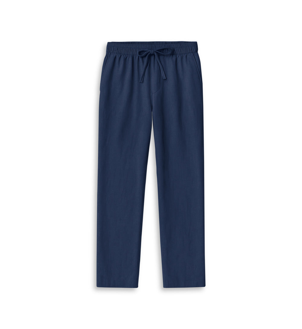 Crafted from 100% premium navy colored linen sourced from Portugal, these pants from House of Malabaar strike the perfect balance between understated elegance and comfort. The rich, dark hue adds a touch of sophistication, while the soft, breathable fabric ensures all-day comfort. Designed with a relaxed fit, these pants transition seamlessly from casual outings to more polished settings. Pair them with a matching crisp shirt.