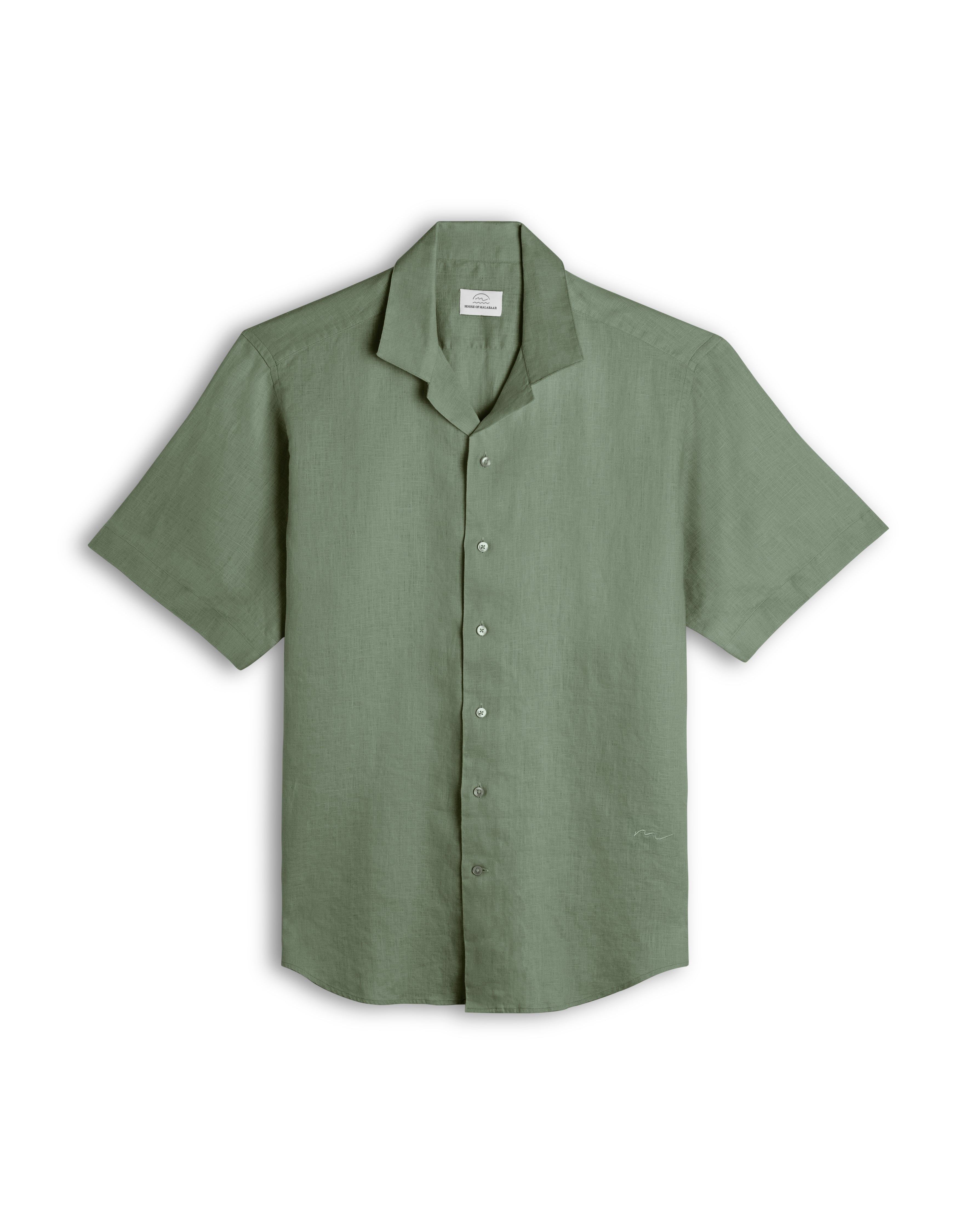 Crafted from 100% premium Sage linen sourced from Portugal, this Cuban Collar shirt from House of Malabaar exudes effortless elegance. Designed with a tailored yet relaxed fit, it offers breathability and comfort, making it an ideal choice for both casual and sophisticated settings. The shirt features a Cuban collar, short sleeves, and a lightweight fabric that allows for movement and versatility. Pair it with matching linen trousers or style it with your favorite HOM swimming shorts.