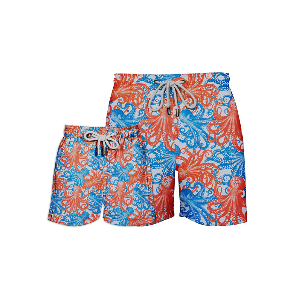 The many tentacles of octopuses swirl all over this print, giving it an air of revelry. With its bright colors and detailed illustrations, it suits both high-energy pool parties and summer days wandering through breezy seaside locales.